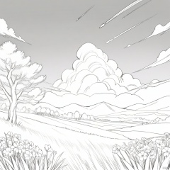 scenery, outdoors, sky, cloud, no humans, star \(sky\), mountain, mountainous horizon, flower, starry sky, grass, landscape, shooting star, nature, tree, blue sky, sunset, cloudy sky, field, night, night sky, plant, hill, evening, cumulonimbus cloud, masterpiece, best quality, very aesthetic, absurdres,