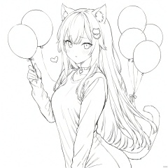 lineart, monochrome, 1girl, animal ears, cat ears, tail, solo, cat tail, hair ornament, heart, grey hair, cat girl, bangs, balloon, white background, blue eyes, simple background, holding, looking at viewer, virtual youtuber, long hair, upper body, long sleeves, white shirt, shirt, heart balloon, blush,