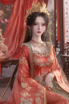 masterpiece,1girl,chinese clothes,crown,floral print,gem,gold,jewelry,lips,lipstick,long hair,looking at viewer,makeup,red lips,solo,earrings,hair ornament,necklace,red dress,Red cloth shoes,indoor, sitting,traditional wedding, festive, wedding, ,Xlimuwan,full_body, hanfu,fengguanxiapei,,(big breasts:1.69), Yunxiao_xianzi,Xtianqiong,Xsulingyun,