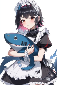 ((HRD, HUD, 8K)),((masterpiece, best quality)), highly detailed,EllenJoe, 1girl, stuffed toy, red eyes, stuffed animal, black hair, multicolored hair, maid, red hair, mole, maid headdress, solo, looking at viewer, mole under eye, short hair, piercing, apron, holding stuffed toy, stuffed shark, chain, ear piercing, short sleeves, bangs, two-tone hair, closed mouth, dress, holding, blush, black dress, jewelry, collar, puffy sleeves, object hug, maid apron, <lora:20240705-1720168506454:0.8>