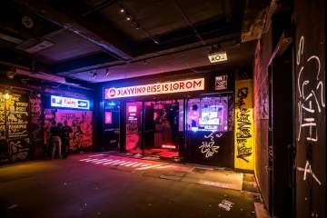 storefront,<lora:20240314-1710430939274-0006:0.6>,best qualtiy,masterpiece,night,neon lights,underground club,<lora:underground club:0.4>,club entrance,graffiti,brick wall,underground,