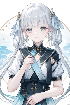 1girl, solo, long hair, looking at viewer, smile, bangs, hair ornament, holding, twintails, jewelry, closed mouth, upper body, white hair, earrings, grey eyes