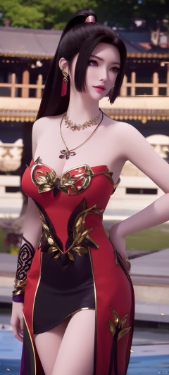 lingmeier, solo, red dress, jewelry, dress, looking at viewer, earrings, purple eyes, necklace, hair ornament, black hair, cowboy_shot, realistic,masterpiece,best quality