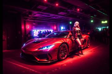 underground club,(1girl:1.2),(auto show girl:1.2),handrail,necklace,red coat,white short skirt,long hair,jewelry,wristband,light and shade contrast,<lora:20240219-1708348660407-0006:0.7>,best qualtiy,masterpiece,movie-level quality,night club,<lora:兰博基尼_v1.0:0.3>,red sports car,magazine photos,DSLR,brilliant lighting,impactful picture,exquisite details,frontal view,show girl focus,neon lights,smile,