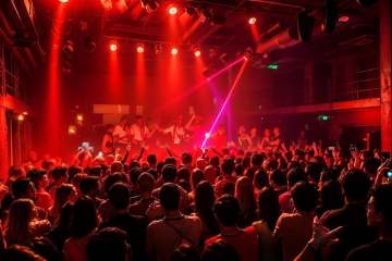 underground club,multiple boys,multiple girls,handrail,necklace,long hair,jewelry,wristband,ruins,light and shade contrast,Dark light,Beam light,laser light,depth of field,scenery,neon lights,<lora:20240219-1708348660407-0006:0.7>,best qualtiy,masterpiece,movie-level quality,nightclub,industrial,brick wall,tattoo,architecture,fire,red sky,evening,explosion,red theme,
