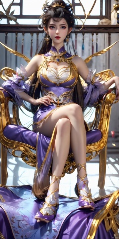 best quality,masterpiece,realistic,ultra-fine painting,extreme detail description,Professional,Vivid Colors,extremely detailed CG unity 8k wallpaper,an extremely delicate and beautiful,official art,sweet and delicate girl,delicate facial features,Bright,romantic long hair,natural light,warm and sweet,looking_at_viewer,upper_body,flower,butterfly,necklace,smile,petal,xiaolan,1girl,black hair,blue eyes,earrings,hair ornament,jewelry,long hair,solo,gold,mole under eye,bare shoulders,detached sleeves,cleavage,sleeveless,breasts,purple dress,red lips,makeup,facial mark,looking at viewer,hair bun,cleavage,(full-body:1.4),Sitting,