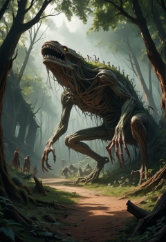 score_9,score_8_up,score_7_up,Nestled deep within a forbidden forest,a monstrous dwelling emerges from the shadows,Its entrance guarded by gargantuan bones,the air thick with the scent of decay,Inside lies a labyrinth of terror,adorned with gruesome trophies and twisted creations that defy nature,waiting to ensnare the unwary traveler,