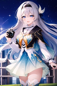 (masterpiece, best quality:1.2),insanely detailed,absurdres,ultra-highres,ultra-detailed,best quality,slender,kawaii,perfect symmetrical face,ultra cute girl,ultra cute face,ultra detailed eyes,ultra cute,ultra beautifu,<lora:firefly-000001:1>,firefly \(honkai: star rail\),1girl,solo,camera,multicolored thighhighs,long hair,holding,hairband,smile,looking at viewer,black hairband,holding camera,open mouth,black jacket,sky,multicolored thighhighs,skirt,multicolored eyes,grey hair,long sleeves,cowboy shot,hair intakes,white shirt,white shirt,zettai ryouiki,blue skirt,outdoors,star \(sky\),black jacket,:d,black jacket,starry sky,sidelocks,orange neckerchief,hair ribbon,