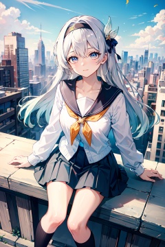 (masterpiece, best quality:1.2),insanely detailed,absurdres,ultra-highres,ultra-detailed,best quality,slender,kawaii,perfect symmetrical face,ultra cute girl,ultra cute face,ultra detailed eyes,ultra cute,ultra beautifu,<lora:firefly-000001:0.7>,firefly \(honkai: star rail\),1girl,solo,skirt,hairband,long hair,grey hair,black hairband,looking at viewer,sitting,hair intakes,pleated skirt,school uniform,bow,sky,shirt,long sleeves,orange neckerchief,socks,closed mouth,cityscape,white shirt,serafuku,sidelocks,city,multicolored eyes,sailor collar,miniskirt,star \(sky\),neckerchief,skyline,knees up,white socks,building,from above,looking up,