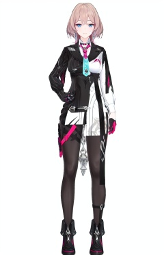 8k,best quality,masterpiece,(ultra-detailed:1.1),(high detailed skin),(full body:1.4),white background,standing,looking at viewer,(solo:1.4),hand on hip,<lora:Lantern-v100-000021:0.8>,dengsfl,def clothes,brown hair,1girl,blue eyes,red necktie,gloves,pantyhose,black footwear,(beautiful_face),((intricate_detail)),clear face,((finely_detailed)),fine_fabric_emphasis,((glossy)),full_shot,