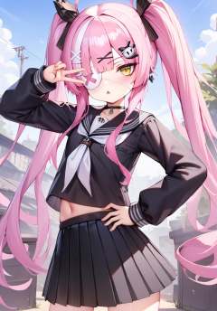 <lora:z47_XL_v1.0:0.8>,z47_\(azur_lane\),twintails, hair_ornament,x hair ornament,yellow eyes, pink_hair, eyepatch, pleated skirt,black serafuku, v over eye, hand on own hip, parted lips, outdoors, masterpiece, best quality,  very aesthetic, absurdres,