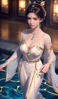 <lora:638-DA-暗河传-白鹤淮-妇人:0.8>(,1girl, ,best quality, ),looking at viewer,  ,ultra detailed background,ultra detailed background,ultra realistic 8k cg,, ,masterpiece,((((1girl, solo,  , solo focus, ,walking on liquid, ))))    (cleavage), (), ,ultra realistic 8k cg,   clean, masterpiece,     cinematic lighting, cinematic bloom, , (( , )),,  , unreal, science fiction, luxury, jewelry, diamond, gold, pearl, gem, sapphire, ruby, emerald, intricate detail, delicate pattern, charming, alluring, seductive, erotic, enchanting, hair ornament, necklace, earrings, bracelet, armlet,see-through sleeves, ,