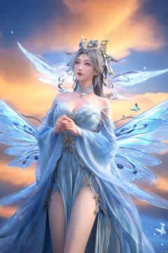 1 girl, dynamic angle, solo, looking at the audience, dress, sky, blue sky, insects, butterflies, branches,,Xningyudie,,(big breasts:1.39),Xtianxiwei, X-aurora, Yunxiao_xianzi,fantasy_butterfly