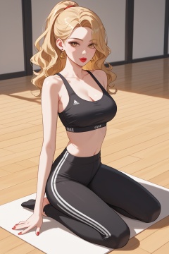 score_9,score_8_up,score_7_up,source_anime,triangle pose, yoga pants and sports bra, Heiress, Average Height, in shape, Triangular Face, Fair Skin, Golden Blonde Hair, gold Eyes, Narrow Nose, Full Lips, Receding Chin, Shoulder-Length Hair, Wavy Hair, Updo, asymmetrical breasts, Dangle earrings, red satin lipstick,Korean girl,