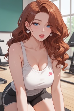 score_9,score_8_up,score_7_up,source_anime,seated forward bend, yoga shorts and **** top, Heiress, Tall, Thin, Heart-Shaped Face, Dark Skin, Auburn Hair, Blue Eyes with Green Flecks, Short Nose, Full Lips, Round Chin, Long Hair, Curly Hair, Angled Bob, firm breasts, Drop earrings, gloss sheer lipstick,Korean girl,