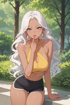 score_9,score_8_up,score_7_up,source_anime,tree pose, bikram shorts and halter top, Starlet, Short, Wide Hips, Square Face, Tan Skin, White Hair, green Eyes, [[Curved Nose]], Thick Lips, Prominent Chin, Long Hair, Curly Hair, Middle Part Bangs, natural breasts, Faux gauge earrings, terracotta stain lipstick,Korean girl,