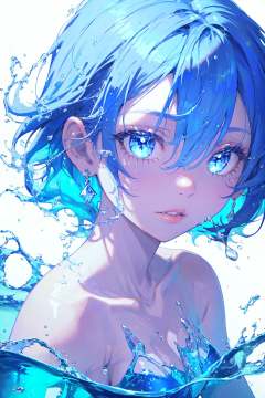 1girl, blue eyes, solo, blue hair, earrings, gem, jewelry, looking at viewer, collarbone, water, blue gemstone, blue theme, eyelashes, bangs, portrait, parted lips, liquid hair, bare shoulders, water drop, upper body, glint, short hair, liquid, simple background, hair between eyes