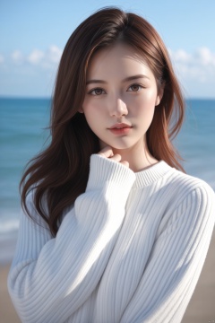 1girl, black_eyes, black_hair, blue_background, blue_sky, brown_eyes, brown_hair, day, holding, lips, long_hair, looking_at_viewer, nose, ocean, outdoors, photorealistic, realistic, red_lips, sky, solo, upper_body, long_sleeves, sweater, sleeves_past_wrists, wind, white_sweater