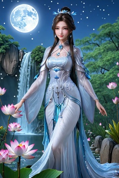 masterpiece,(best quality),official art,(extremely delicate and beautiful),,1girl,Depth of field,kind smile,looking_at_viewer,Dynamic pose,Xluxueqi,(big breasts:1.39), full moon,flowers,Waterfall, lotus, willow, butterfly