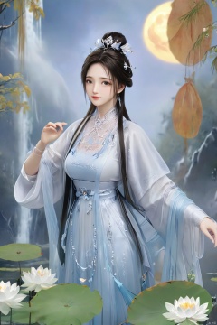 masterpiece,(best quality),official art,(extremely delicate and beautiful),,1girl,Depth of field,kind smile,looking_at_viewer,Dynamic pose,Xluxueqi,(big breasts:1.79), full moon,flowers,Waterfall, lotus, willow, butterfly