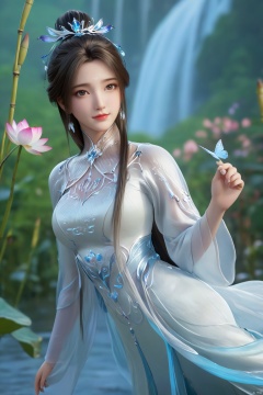 masterpiece,(best quality),official art,(extremely delicate and beautiful),,1girl,Depth of field,kind smile,looking_at_viewer,Dynamic pose,Xluxueqi,(big breasts:1.99), full moon,flowers,Waterfall, lotus, willow, butterfly