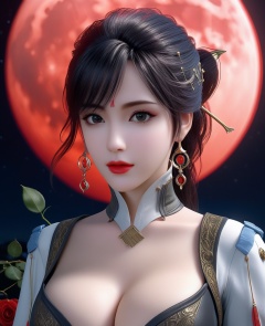 <lora:639-DA-XL-眷思量-须灵犀:0.8>(,1girl, ,best quality, ),looking at viewer,  ,,ultra detailed background,ultra detailed background,ultra realistic 8k cg,, ,masterpiece, (( , )),, ,science fiction,mole, ,    ,red moon, black rose,     (cleavage), (),