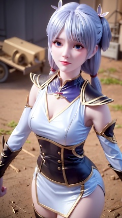 1girl, solo, twintails, blue eyes, dress, detached sleeves, mischevious smile, perfect body, scenery, sharp focus, best quality, masterpiece, detailed outfit, illustration, perfect eyes, finely detailed beautiful anime eyes, realistic skin, intricate details, best lighting, depth of field, ultra high resolution,cowboy_shot, dynamic pose, dynamic angle,
