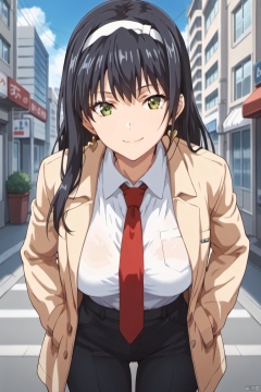 score_9,score_8,score_7,anime style,1girl, solo, SanaHayami, solo,  black hair, long hair, bangs, brown eyes, white headband, big breast,outdoors, city, cowboy shot, looking at viewer, smile, closed mouth, green eyes, open jacket, collared shirt, long sleeves, black necktie, black pants, leaning forward, hands on pocket, standing, golden earrings, heart earrings
