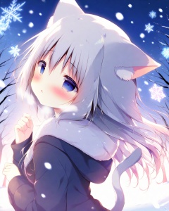 (Best-A:1.1),shiratama \(shiratamaco\),1girl, animal ears, tail, blue eyes, solo, cat tail, cat ears, cat girl, white hair, hood, long hair, animal ear fluff, hood down, outdoors, snow, blush, parted lips, upper body, tree, snowing, winter, snowflakes, fur trim, breath, looking up, hooded jacket, from side