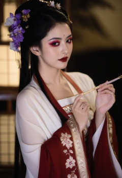 a young woman with long, dark hair. She is adorned with a floral hair ornament that features purple and white flowers. Her makeup is subtle, with a focus on her eyes, which are accentuated with red eyeshadow. Her lips are painted a deep shade of red. She is wearing a white garment with intricate gold embroidery, and she holds a black, slender object, possibly a brush or a pen, in her hand. The lighting in the image is soft, casting a gentle glow on her face, and the background is blurred, emphasizing her as the main subject.