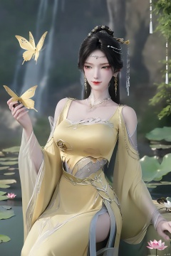 masterpiece,(best quality),official art,(extremely delicate and beautiful),solo,(yellow chinese clothes,yellow dress,bare shoulders,frilled collar,earrings,long sleeves),1girl,solo,black hair,facial mark,forehead mark,hair bun,hair ornament,hair stick,jewelry,long hair,,adfxx,,Xjinpinger,(big breasts:1.59),flowers,Waterfall, lotus, willow, butterfly
