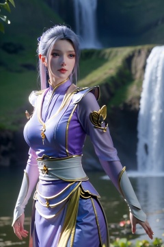masterpiece,(best quality),official art,(extremely delicate and beautiful),1girl, solo, twintails, blue eyes, dress, detached sleeves, mischevious smile, perfect body, scenery, sharp focus, best quality, masterpiece, detailed outfit, illustration, perfect eyes, finely detailed beautiful anime eyes, realistic skin, intricate details, best lighting, depth of field, ultra high resolution,cowboy_shot, dynamic pose, dynamic angle,Xhanxue,(big breasts:1.43),(flowers,Waterfall, lotus, willow, butterfly:1.23),