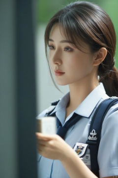 (1girl:1.3), (best quality, masterpiece, ultra high resolution),(photorealistic:1.3), (realistic:1.3), depth of field,(full body:1.2), (day:1.2), (cinematic lighting:1.2),  uniform, OL