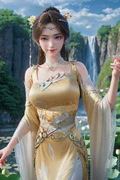 masterpiece,(best quality),official art,(extremely delicate and beautiful),1girl, solo, twintails, blue eyes, dress, detached sleeves, mischevious smile, perfect body, scenery, sharp focus, best quality, masterpiece, detailed outfit, illustration, perfect eyes, finely detailed beautiful anime eyes, realistic skin, intricate details, best lighting, depth of field, ultra high resolution,cowboy_shot, dynamic pose, dynamic angle,Xjinpinger,(big breasts:1.79),(flowers,Waterfall, lotus, willow, butterfly:1.29), X-Hydrangea