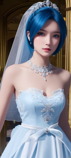 lingmeier, 1girl, blue wedding dress, (blue_hair:1.2) , solo, looking at viewer, cowboy_shot, realistic,masterpiece,best quality,