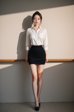 (realism:1.4), perfect light and shadow, Professional lighting, a very cute young little girl, (Pale skin), full body,Exquisite makeup, realistic skin, hair_bun, large_breasts, Slender waist, beautiful and Slender long legs,sexy posing, Standing, backdrop is blackboard full of words, Professional photography, Fujicolor Pro 400, sunset, 8K Ultra-high resolution RAW photo, (very rich detail:1.3), (film grain), sharp focus, Vivid Colors, score_9, score_8_up, score_7_up