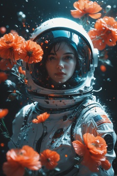 cinematic photo, perfectly centered girl portrait detailed astronaut with flowers explosion helmets,anatomical drawing,dripping paint,coquelicot color,volumetric lighting,unreal engine,blender model,3d model,incredible bokeh . 35mm photograph,film,bokeh,professional,4k,highly detailed,