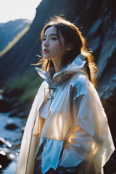 analog film photo chinese girl, cinematic film still, ((Establishing_Shot)), ((looking away)), expression of enjoyment, an ultra high definition professional high fashion portrait full length photograph, a model wearing a transparent pearlescent raincoat in an icelandic black rock environment at dawn, no artefacts, extremely detailed, stark, refraction, shallow depth of field, volumetric light and shadow, ray tracing, light rays, shallow depth of field, vignette, highly detailed, high budget, bokeh, cinemascope, moody, epic, gorgeous, film grain, grainy . faded film, desaturated, 35mm photo, grainy, vignette, vintage, Kodachrome, Lomography, stained, highly detailed, found footage, monkren, Fairy, realistic,sunlight