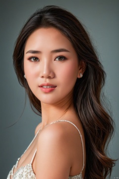 ( Fujicolor, UHD, super detail ,raw,85mm,f/1.2,FujifilmXT4,16K) , cleavage, breasts,1girl, earrings, solo, realistic, jewelry, piercing, teeth, upper_body, black hair, brown_eyes, looking_at_viewer, nose,sunying2.0