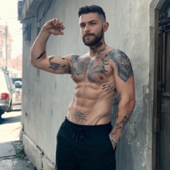 1boy, abs, arm tattoo, short hair,day, euphil,  realistic, solo,  <lora:SD1.5_EUPhil.v1.0:0.6>