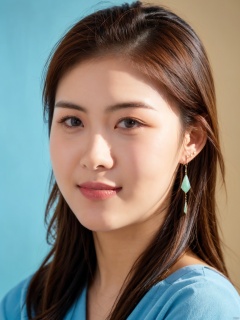 1girl, solo, looking at viewer, smile, brown hair, brown eyes, jewelry, closed mouth, upper body, earrings, lips, blue background, portrait, realistic, nose, jingjing