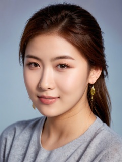 1girl, solo, looking at viewer, smile, brown hair, brown eyes, jewelry, closed mouth, upper body, earrings, lips, blue background, portrait, realistic, nose, jingjing