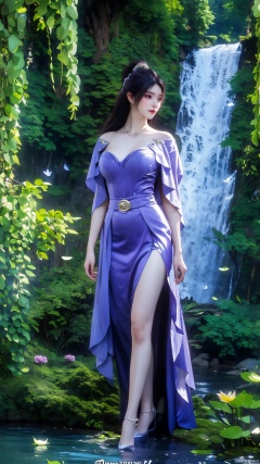 masterpiece,(best quality),official art,(extremely delicate and beautiful),solo,full_body,wonderland,scarlet_moon,moonlight, 1girl,Xjiziyue,,(big breasts:1.59),X-Hydrangea,(flowers,Waterfall, lotus, willow, butterfly:1.23),