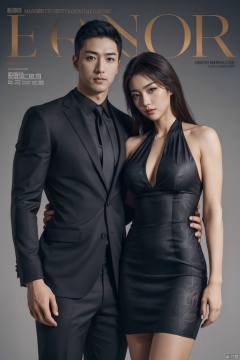👫,a Handsome man and a sexy woman hugging together,standing,Asian,exquisite facial features,(muscular man wearing formal suit), (slim woman wearing black halter dress black print pantyhose), face to face, affectionate, charming eyes,(simple background), graceful yet melancholic posture,fluorescent light,double exposure,Canon 5d mark 4,Depth of field 270mm,elaborate,fine artistic composition,fabulous colors,very inspirational,complex artistic color composition,masterpiece, realistic, best quality, highly detailed,jzns,plns,Magazine cover,brxu,lly