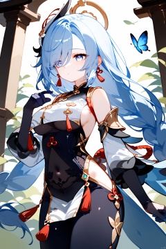 score_9,score_8_up,score_7_up,1girl,absurdres,bare_shoulders,black_bodysuit,black_gloves,blue_butterfly,blue_eyes,breast_curtain,calamity_queller_\(genshin_impact\),closed_mouth,covered_navel,expressionless,eyelashes,eyes_visible_through_hair,floating_hair,gold_trim,hair_between_eyes,hair_ornament,hair_over_one_eye,hand_up,highres,hip_vent,kuji-in,looking_to_the_side,low-braided_long_hair,low-tied_long_hair,shenhe_\(genshin_impact\),sidelocks,single_braid,single_earring,solo,swept_bangs,tassel_earrings,thighs,very_long_hair,white_hair,