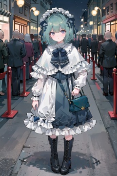 full body, (blouse, red long skirt, lace-up boots, Hair ribbon, handbag, , brown capelet, frilled shawl, )1girl, solo, Aqua green hair, short hair, bow, blue bow, hair ornament, hand on hip, red lips, parted lips, night, makeup, best quality, high resolution illustration, Amazing, highres, intricate detail, best illumination, best shadow, an extremely delicate and beautiful, looking at viewer, city, road, street, crosswalk, <lora:EMS-58280-EMS:0.500000>, , <lora:EMS-85720-EMS:0.700000>