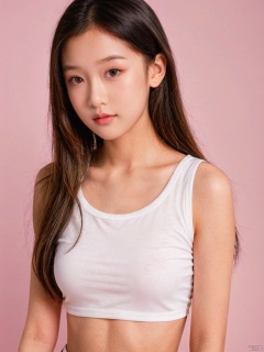 female child,pink_background, 1girl, solo, long_hair, lips, realistic, gradient_background, gradient, crop_top, black_hair, upper_body, sleeveless, brown_eyes, shirt, looking_at_viewer, midriff