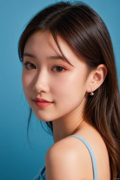 1girl, solo, looking at viewer, smile,  brown hair,  brown eyes, jewelry, closed mouth, upper body, earrings, lips, blue background, portrait, realistic, nose, jiaxin