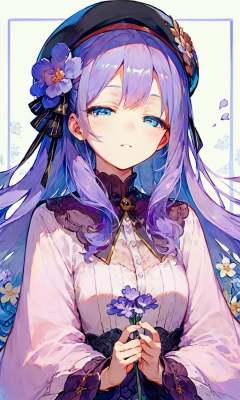 score_9,score_8_up,score_7_up,solo,flower,1girl,purple flower,hat,blue eyes,asahina mafuyu,looking at viewer,black headwear,long hair,holding,hair ornament,upper body,hair flower,half-closed eyes,beret,purple hair,