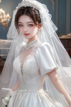 Ultra-clear 8k, real, night, smile, crown, necklace, perspective, hanger, nudity, diamonds, bridal veil, Golden wedding dress, 1 girl, ,wedding dress,MATURE FEMALE,1girl,moyou,depth of field, Asian girl